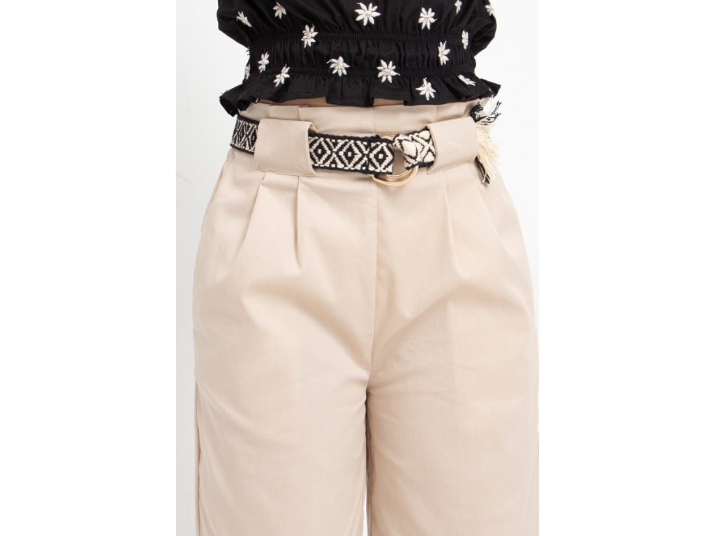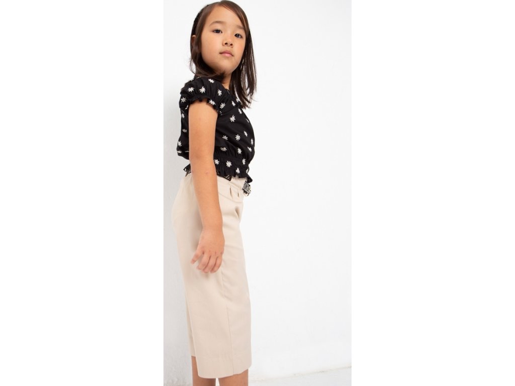 Dívčí kalhoty s širokým rovným střihem, vypasovaným pasem a boky. Vysoký pas. Knoflíky na zapínání. Nastavitelný pásek pro dívku.