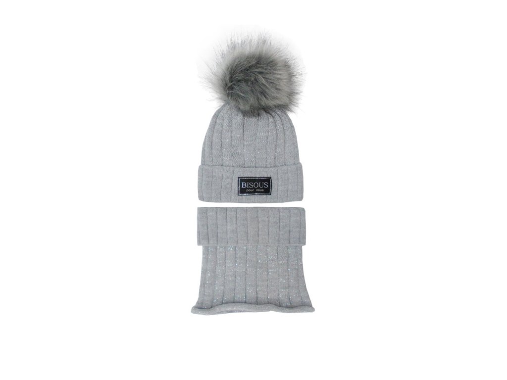 Dívčí třpytivý set - čepice Bisous s bambulí a tunel 42-514 šedá