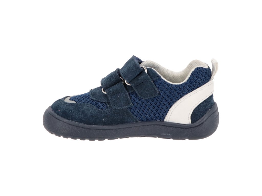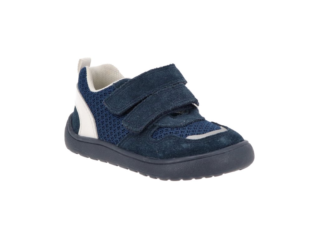 Topánky majú tmavomodrý (marine) základ, vrátane tmavomodrej podrážky, ktorý je decentne doplnený o biely pásik v oblasti päty. Tento detail farebne ladí s putkom na päte aj vnútorným polstrovaním, čím vytvára čistý a nadčasový dizajn. Na špičke sa nachádza vklad s reflexným prvkom, ktorý zvyšuje viditeľnosť dieťaťa.